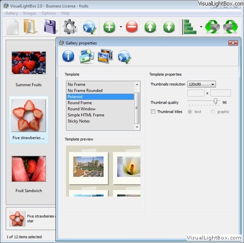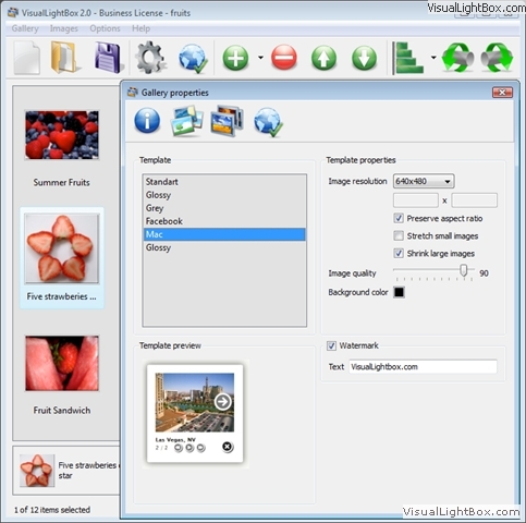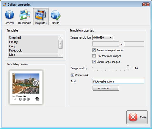 On the third tab of the Gallery Properties window you can select the template, Image resolution and Image quality of your pictures and change the Watermark.