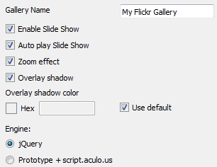 On the first tab of the Gallery Properties window you can change the name of your photo album and enable/disable the following properties: Slide Show, Auto play Slide Show, Zoom effect, Overlay Shadow. You can also set the Overlay shadow color and select the Engine you want to use (jQuery or Prototype + script.aculo.us).