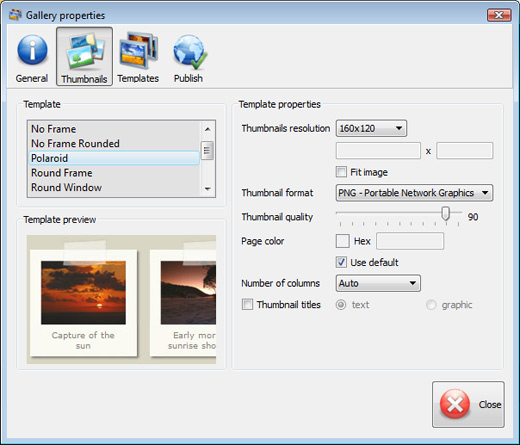 On the second tab of the Gallery Properties window you can select the thumbnail you want to use, set the Thumbnails Resolution, Thumbnails Quality, Thumbnails Titles. Select Thumbnails Format (save in PNG or JPG format). Specify the Number of columns in you photo album and the Page color.
